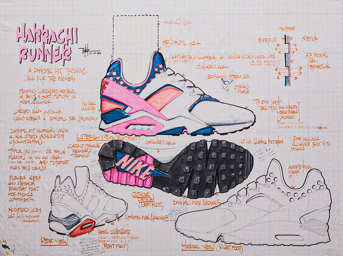 O nome não foi escolhido à toa: “Huarache” vem de uma sandália tradicional mexicana (warachi), símbolo de conforto e simplicidade, muito associada à cultura hippie. Essa inspiração serviu de base para Hatfield pensar em um tênis que fosse diferente de tudo que havia no mercado: leve, anatômico e que abraçasse o pé como se fosse uma extensão dele.
